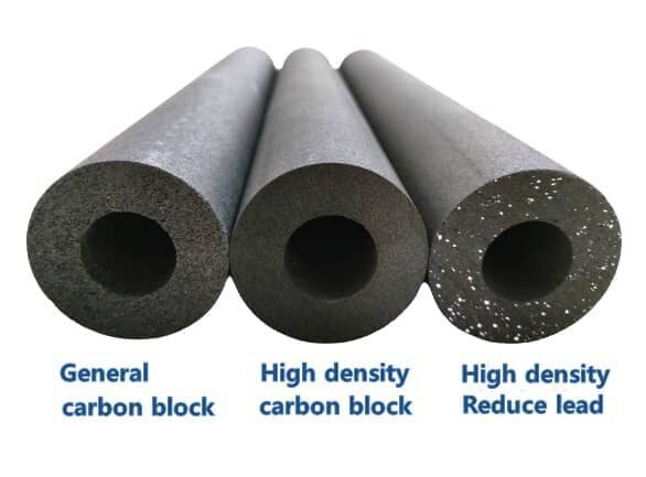 Karbon aktif dapat menyaring sisa klorin dan bau aneh, dan batang karbon aktif berdensitas tinggi memiliki efek adsorpsi yang lebih baik dan masa pakai lebih lama. Karena permukaan batang karbon aktif densitas tinggi memiliki sejumlah besar pori-pori bagian dalam yang halus, luas permukaan spesifik lebih besar daripada karbon aktif biasa; sehingga kecepatan adsorpsi sangat cepat dan kapasitas adsorpsi besar. Selain itu, pori-porinya antara 0,5 dan 1 mikron, yang dapat menyaring kotoran seperti kista, parasit, dan partikel plastik.